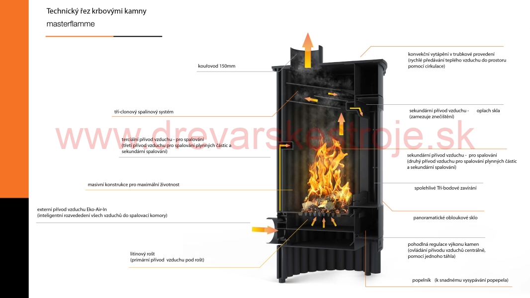 Krbová kamna Masterflamme díky své masivní konstrukci zastupují vysoce kvalitní segment trhu. Trubkové řešení spalovací komory zajišťuje velmi nízkou roztažnost materiálu, vysokou kvalitu a dlouhou životnost celého zařízení. Trubky zaručují maximální předání tepla a velmi rychlé ohřátí vzduchu proudícího v trubkách.