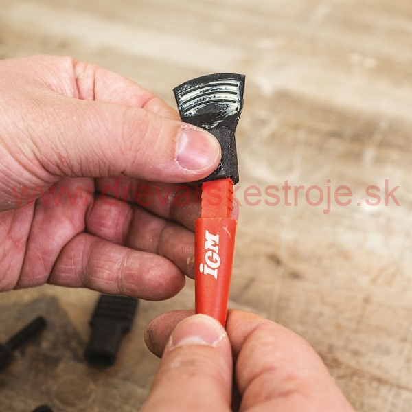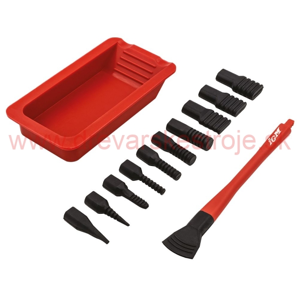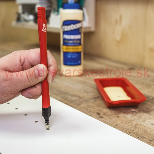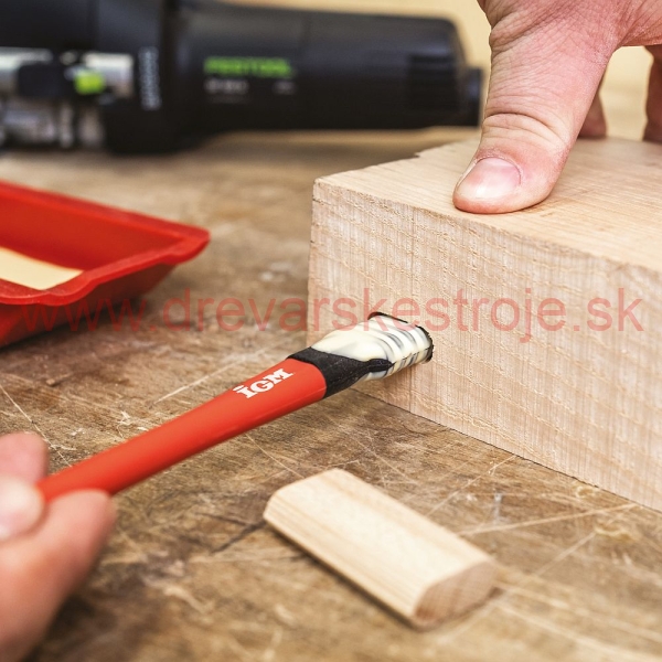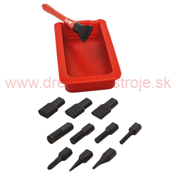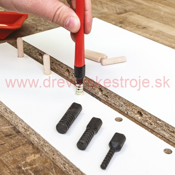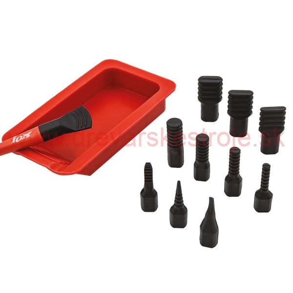 IGM Silikónová sada s aplikátormi v 10 veľkostiach uľahčí nanášanie lepidla do otvorov pre kolíky, DOMINO kolíky, či lamely, a tiež do drážok, škár a iných otvorov. Mäkké silikónové nástavce rovnomerne rozotrú lepidlo po celej ploche dreva vo vnútri každého otvoru.